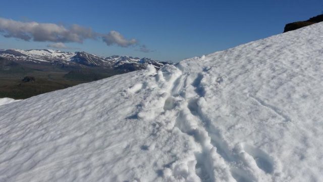 Für den nächsten Tag stand „Wollkleidung“ bei Devold shoppen auf dem Programm und die Wanderung auf den „Frostadtinden“. Auch dies wieder eine wunderschöne Wanderung mit tollen Fernblicken auf die Inselwelt vor Alesund. Nachdem wir den Gipfel erreicht hatten, mußten wir „bäuchlings“ ein kleines Schneefeld passieren… Es ist halt noch Frühsommer hier und noch ist nicht aller Schnee getaut.