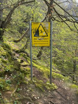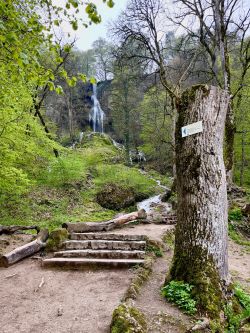 Heute haben wir uns einen Premiumwanderweg ausgesucht, den Wasserfallsteig. Es geht los zum Bad Uracher Wasserfall, der erstaunlich eindrucksvoll ist. Er stürzt 37 Meter frei in die Tiefe und fließt weitere 50 Meter über Kalktuffgestein in den Brühlbach.