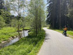 Aktion des heutigen Tages: Radfahren. Nachdem es gestern im tschechischen Nationalpark so schön war, versuchen wir es heute mit der deutschen Seite. Es geht vom Campingplatz über das Freilichtmuseum gefühlt immer nur bergab bis zur Sagwassersäge, zwischendurch geht es immer mal rauf und runter, aber irgendwie müssen wir die ganzen Höhenmeter ja auch wieder rauf. Glücklicherweise wird der Anstieg dann aber doch nicht so heftig wie erwartet, aber wir fahren unsere Fahrradakkus trotzdem so gut wie leer. War eine schöne Runde bei sonnigem Wetter, hat uns aber nicht so gut gefallen, wie die gestrige Tour im tschechischen Nationalpark „Sumava“.