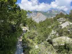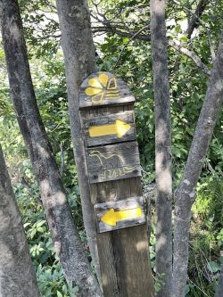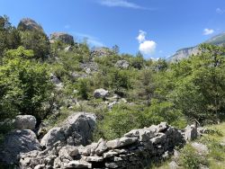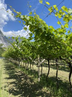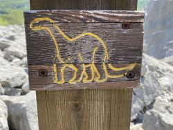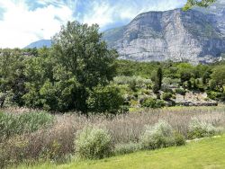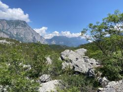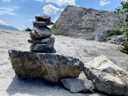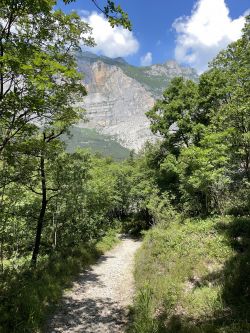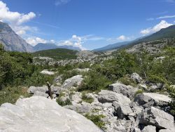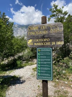 An unserem letzten Tag in Italien am „Lago di Ledro“ gehen wir nochmal wandern. Wir wählen den Dinosaurier-Rundgang im Biosphärenreservat „Marocche di Dro“. Der Pfad hat seinen Namen erhalten, weil hier Dinospuren (ca. 190 Mio. Jahre alt) gefunden wurden. Die Landschaft gleicht einer Mondlandschaft, sie ist in der Eiszeit entstanden. Infolge geschmolzener Gletscher verloren die Feldwände ihren Halt und stürzten ins Tal. Über diese großen und kleinen Brocken führt dann auch unser Weg, was am Schluss etwas mühsam wird, weil wir in der prallen Sonne laufen und es dann doch einige Höhenmeter sind. Hat sich aber absolut gelohnt. Danach besuchen wir noch die Ruinen des „Castel Drena“, weil es fast auf dem Rückweg zum Lago liegt. Gut, kann man besichtigen, ist aber nicht so wirklich lohnenswert.