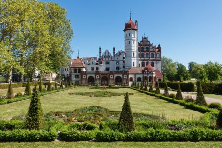 Der Ostflügel wurde zwischen 1891 und 1895 nach Plänen des Architekten Albrecht Haupt aus Hannover im sogenannten Johann-Albrecht-Stil (eine mecklenburgische Stilrichtung der Neorenaissance, gekennzeichnet insbesondere durch rote Terrakotten im Kontrast zu hellem Putz) errichtet, dem auch die anderen Schlossflügel angepasst wurden.
