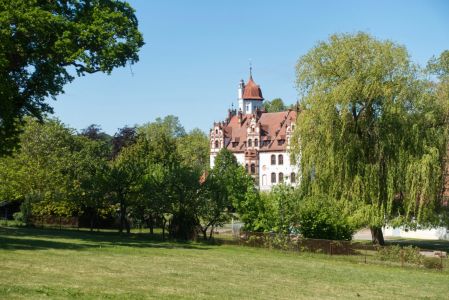 Markant sind insbesondere die zahlreichen Terrakotta-Medaillons an der Fassade, die verschiedene Köpfe zeigen. Die Herkunft der Medaillons ist unbekannt, vermutlich handelt es sich um Abgüsse italienischer Vorlagen. Besonders schmuckvoll ist die Fassade des Portals des Ostflügels zum heute nicht mehr zugänglichen Innenhof, die als Backsteinbau mit unzähligen Zierelementen aus Sandstein ausgeführt ist. Der Ostflügel besaß ursprünglich auch eine ausladende Freitreppe nach Südosten zum Landschaftspark.