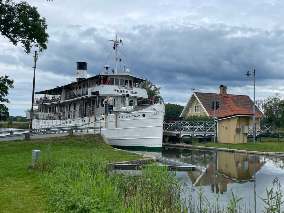 So, der Götakanal ruft und wir fahren mit dem Rad von Sjötorp bis nach Tatorp. Vom Campingplatz aus sind das hin und zurück knapp 90 Kilometer. Wir haben Glück mit dem Wetter, es ist zwar bedeckt aber regnet nicht, hin und wieder lässt dich sogar die Sonne kurz blicken. Wir kommen an etlichen kleinen Schleusen vorbei und auf dem Rückweg begegnen wir tatsächlich noch einem Fahrgastschiff, was offensichtlich aus Göteborg kommt und den 190 Kilometer langen Kanal bis Stockholm fährt. Wieder in Sjötorp angekommen, kehren wir noch im „Perssons i Backen“ ein, wo es Fish & Chips mit fangfrischem Fisch aus dem Vänernsee gibt. Wir lassen es uns schmecken.