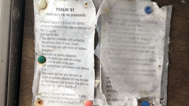 In der Kabine dienen ein Fläschchen Weihwasser und ein Aushang von Psalm 91 der Beruhigung ängstlicher Fahrgäste.