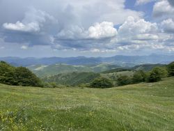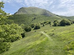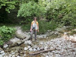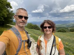 Heute besuchen wir den „Bosco di San Francesco“, einen Naturpark, dessen Eingang direkt neben der Basilika in Assisi liegt. Man vermutet hier eher etwas wie einen angelegten Park mit vielen Blumen, allerdings handelt es sich eher um ein mehrere Hektar großes „Wald-Naturgebiet“. Der Weg führt durch wertvollen Baumbestand abwärts zum Fluss „Tescio“. Der zweite Teil des Weges ist dann leider nicht mehr vollständig begehbar, da hier 2023 ein schweres Unwetter u.a. die Möglichkeit den Fluss zu überschreiten zerstört hat. Wir gehen bis zur Landart-Installation von Michelangelo Pistoletti. Er pflanzte 121 Olivenbäume und formte daraus 3 Kreise. Das Ganze heißt „Das 3. Paradies“. Der Kreis in der Mitte symbolisiert die Möglichkeit einer friedlichen Koexistenz von Mensch und Natur.